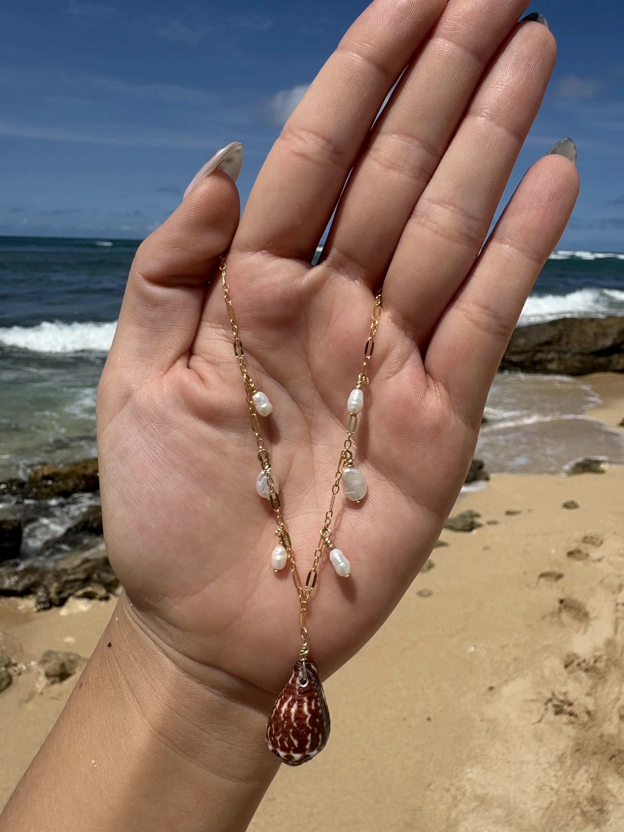 Note: Small batch designs means that only a limited amount is available for a limited time. ONLY ONE, EXACT IN PHOTO with the same mini hebrew cone, triton, honey cowrie, and Hawaiian drupe shell.