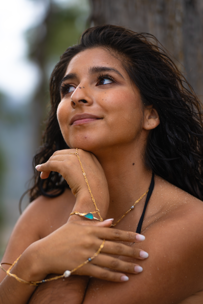 Our most popular seller turned into a bracelet! Lā means “sun” in Hawaiian, which was our inspiration for this design. Featuring a sun charm at the clasp paired with a mini punctured miter, tumbled cone, auger, honey cowry, and sunrise shell chip.