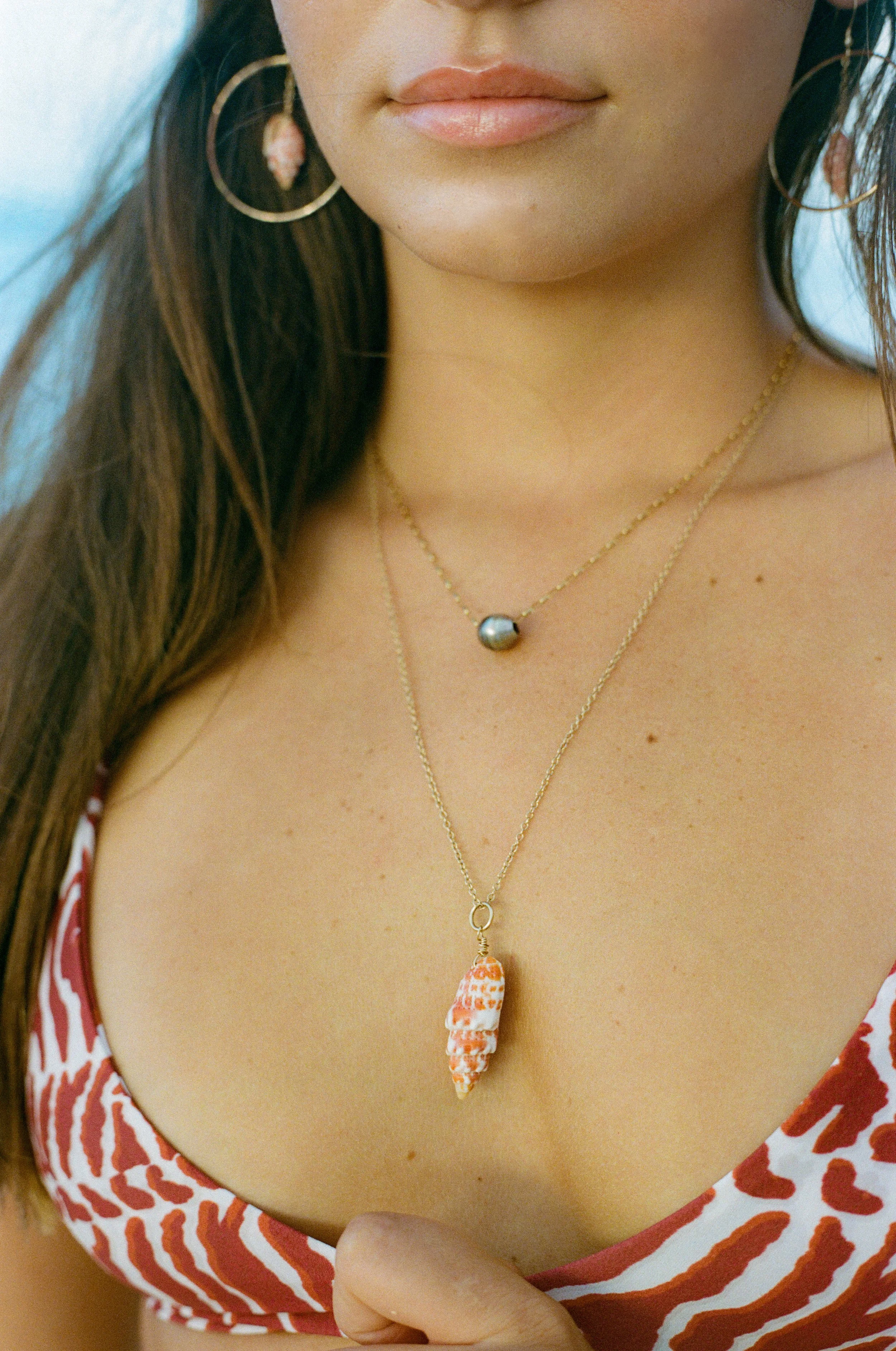 Our Velzyland Necklace is one of our most popular sellers. Features a gorgeous, bright punctured miter as the centerpiece — surrounded by a triton, honey cowry, flea cone, and rat cone shell.